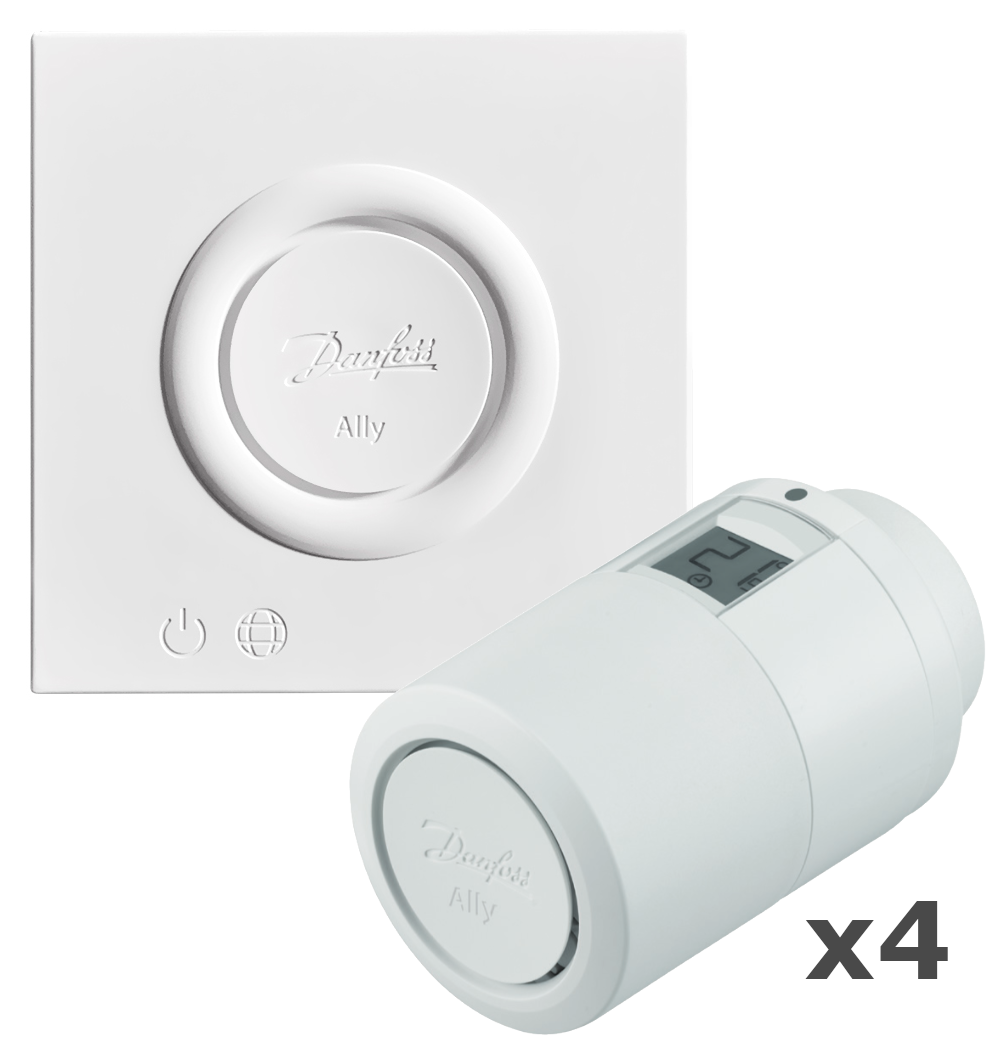 Das Starterset für intelligentes Heizen enthält die zentrale Einheit Danfoss Ally Gateway, eine Relais-Einheit für Kessel und einen elektronischen kabellosen Thermostatkopf Danfoss Ally. Das System ist sowohl für Haushalte mit Heizkörpern als auch für Fußbodenheizungen geeignet.