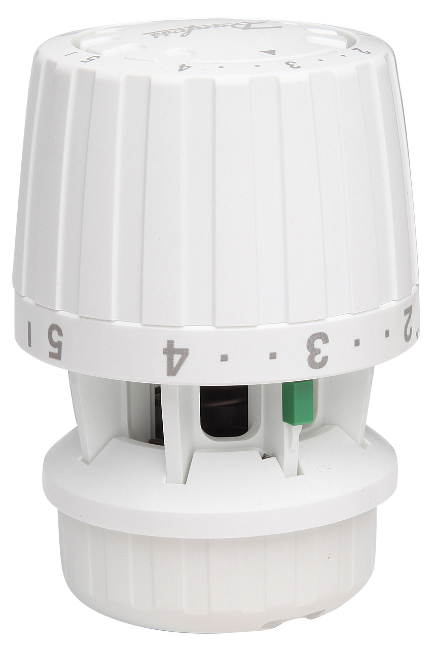 Der Kopf erfasst die Raumtemperatur und stellt auf dieser Grundlage den Öffnungsgrad des Ventils ein. Der mit Gas gefüllte Balg zieht sich bei sinkender Raumtemperatur zusammen, wodurch das Ventil geöffnet und warmes Wasser in den Heizkörper geleitet wird. Bei Erwärmung des Raumes dehnt sich der Balg wieder aus und das Ventil schließt.