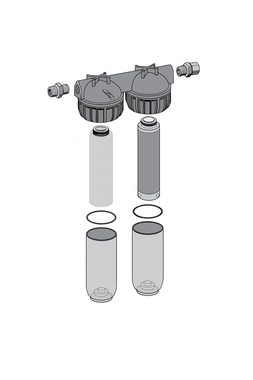 Feiner DUPLEX-Filter für Regenwasser FF40 von Honeywell mit Sieb und Einsatz. Der Filter wird zur Aufbereitung und Reinigung von Regenwasser für einfache Systeme zum Bewässern, Spülen, Waschen und andere technische Zwecke verwendet, bei denen kein Trinkwasser erforderlich ist. Der Polypropylen-Einsatz verhindert das Eindringen von Rostpartikeln, Sand und anderen, wodurch die Wahrscheinlichkeit von Korrosion verringert und das Wasserversorgungssystem vor Verstopfung geschützt wird. Der Aktivkohleeinsatz filtert gelöste organische Materialien und Chlor. Der Filter gewährleistet eine kontinuierliche Versorgung mit gefiltertem Wasser.