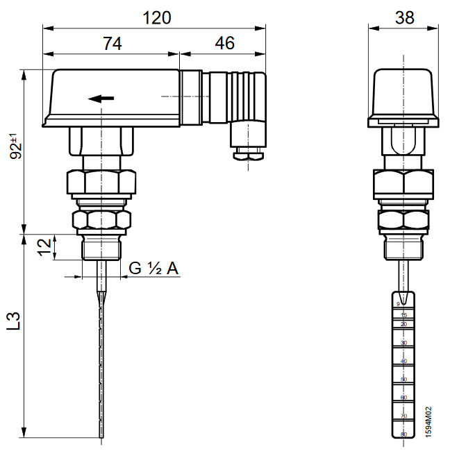 Der Schalter wird in ein T-Stück 1/2" montiert. Vor und hinter der Stelle, an der der Schalter montiert wird, muss ein Beruhigungsabschnitt in der Länge von 10-fachem Nennfluss des Rohrs vorhanden sein. Der Pfeil auf dem Gehäuse des Schalters sollte bei der Installation in Richtung des Durchflusses zeigen.