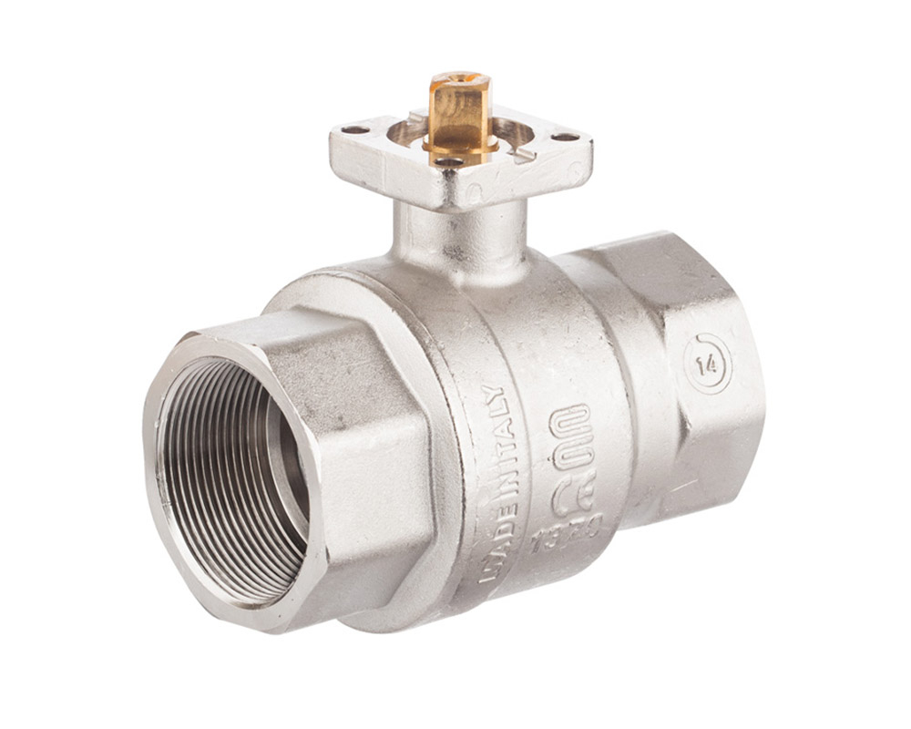 Zweikanaliger Messing-Kugelhahn für die Automatisierung. Das Ventil ist mit einer standardisierten ISO-Flansch (nach ISO 5211) für den Anschluss von Pneumatikantrieben und Servoantrieben ausgestattet.