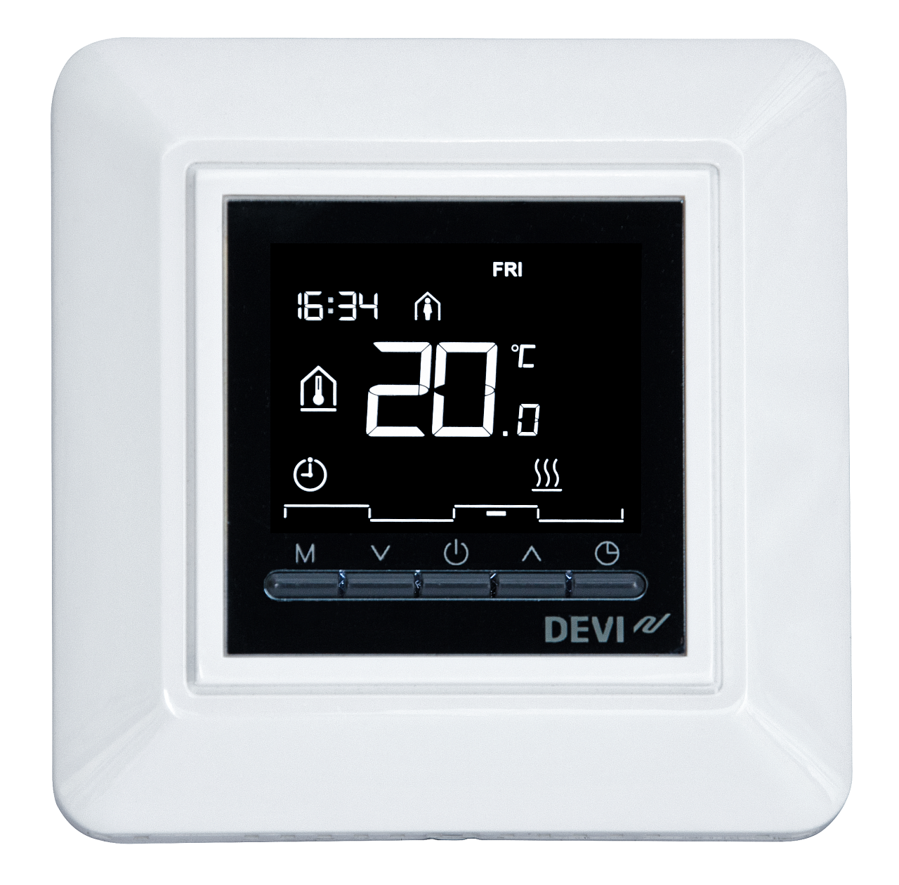 Der elektronische Thermostat Danfoss DEVIreg Opti ist programmierbar und über die Tasten unter dem Display einstellbar. Er passt sich den Eigenschaften des beheizten Raumes an. Ideal geeignet für elektrische Fußbodenheizung, kann aber auch für die Beheizung des gesamten Raumes verwendet werden. Dieses Modell wird mit einem Designrahmen in der Farbe Weiß RAL 9010 geliefert.