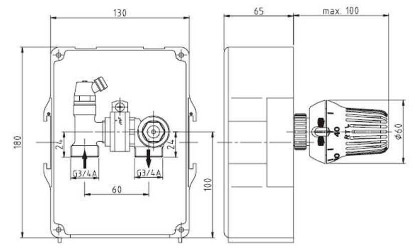 Das Set ist zur Begrenzung der Rücklauftemperatur in Fußbodenheizungssystemen und in Systemen, die Fußbodenheizung mit anderen Heizkörpern kombinieren, bestimmt. Um eine Beschädigung des Bodenbelags zu vermeiden, muss auf den richtigen Wert der Vorlauftemperatur geachtet werden. Der Temperaturbegrenzer kann für eine Temperatur im Bereich von 20...50 °C eingestellt werden. Der einstellbare Thermostatkopf ragt aus dem Gehäuse heraus.