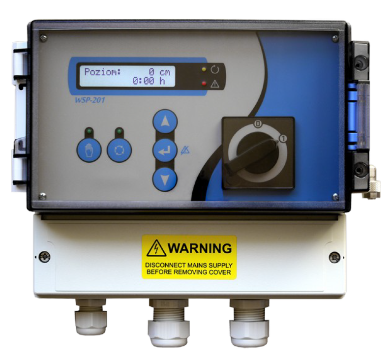 Schaltschrank Wilo WSP 201 mit einem 10 m langen Druckschlauch und Glocke für Pumpen mit 230 V oder 400 V Stromversorgung. Der Schrank steuert die Pumpen in Abhängigkeit vom Füllstand. Der Füllstand kann mittels Druck, Sprührohr, externem Sensor oder Schwimmerschalter gemessen werden.