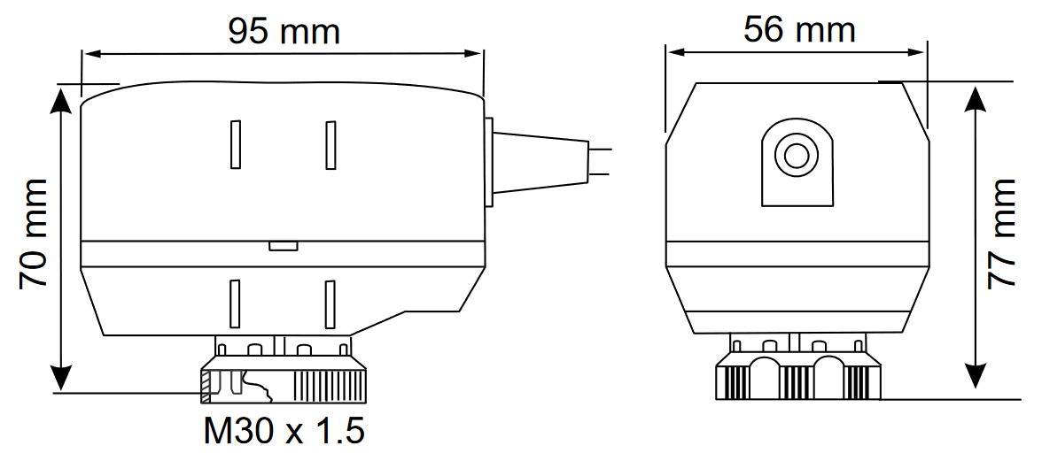 Der Servoantrieb verfügt über eine Steuerkraft von 100 N und sein maximaler Hub ist durch den Ventilsitz begrenzt. In beiden Endpositionen hat der Antrieb keinen Stromverbrauch. Der Antrieb wird über ein integriertes Kabel mit einer Länge von 0,8 m versorgt.