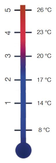 Die Temperatur am Kopf ist mit 5 Zahlen gekennzeichnet. Der Temperaturunterschied zwischen den einzelnen Zahlen entspricht 3 °C.