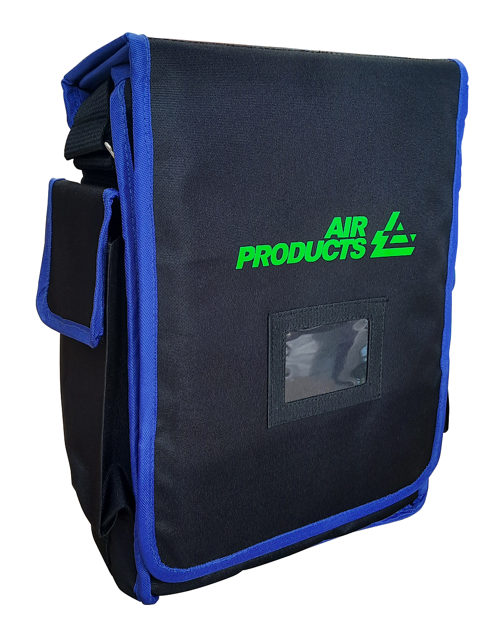 Tragbare Textiltasche/Koffer für Kalibrierflaschen mit Schultergurt. In den Koffer passen bis zu 3 Flaschen mit einer Größe von 110 l. An den Seiten befinden sich zwei Taschen.