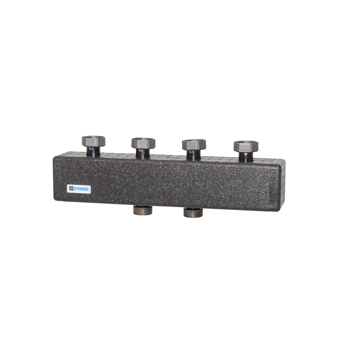 Verteiler für Pumpengruppen mit Anschlussgröße DN 25-32 der Serie GxA100. Er wird in einem Isoliergehäuse und mit Halterungen zur Wandmontage geliefert. Der Verteiler ist farblich gekennzeichnet, um die Installation so einfach wie möglich zu gestalten.