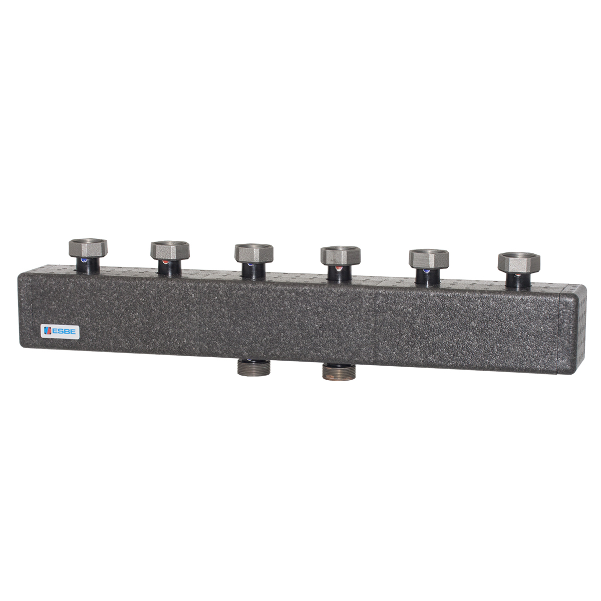Verteiler für Pumpengruppen mit Anschlussgröße DN 25-32 der Serie GxA100. Er wird in einem Isoliergehäuse und mit Halterungen zur Wandmontage geliefert. Der Verteiler ist farblich gekennzeichnet, um die Installation so einfach wie möglich zu gestalten.