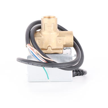 Dreiwege-Verteilzonenventil mit eingebautem elektrischem Antrieb Honeywell V4044F1000 mit Anschluss DN 20. Der Antrieb ist mit einer Feder für die Rückstellung ausgestattet.
